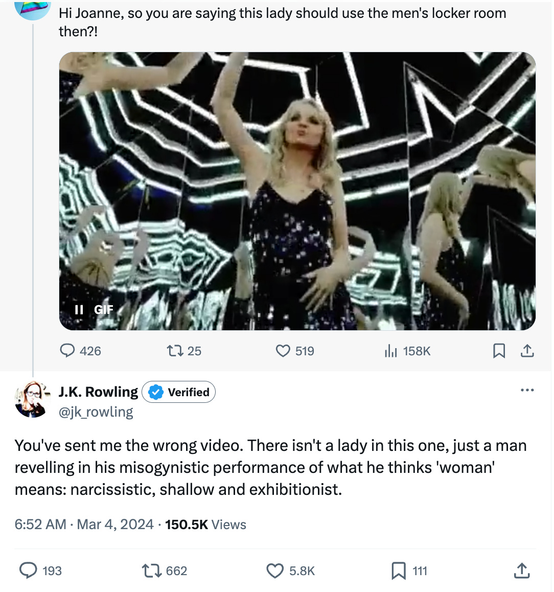 In response to someone on social media pointing out that Rowling was suggesting that Willoughby, a trans woman who has undergone gender reassignment surgery, ought to use a men’s locker room, Rowling snidely wrote, “You've sent me the wrong video. There isn't a lady in this one, just a man revelling in his misogynistic performance of what he thinks 'woman' means: narcissistic, shallow and exhibitionist.”