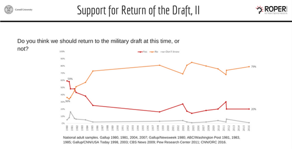 Since the end of Vietnam, the United States has fought in approximately 20 other wars, all with an all-volunteer military. Even during the height of the Iraq War, when all of America outside of the anti-war Left was totally gung-ho for war and awash in tiny flag pins and Freedom Fries, only 27 percent of Americans wanted to reinstitute the draft. Since then, support has mostly stayed at around 20 percent or less .