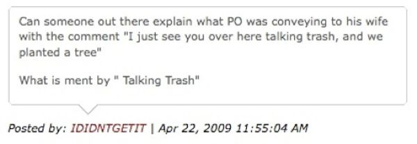 Yesterday the President and First Lady and Bill Clinton and some other important types planted some stuff out on the Anacostia River, including a tree or two, and Barack started joshing with Michelle about who's the better tree-planter. This completely confused one "Political Punch" reader. SHHHH nobody tell them that "talking trash" is code for "doing it in the butt." [ Political Punch ]