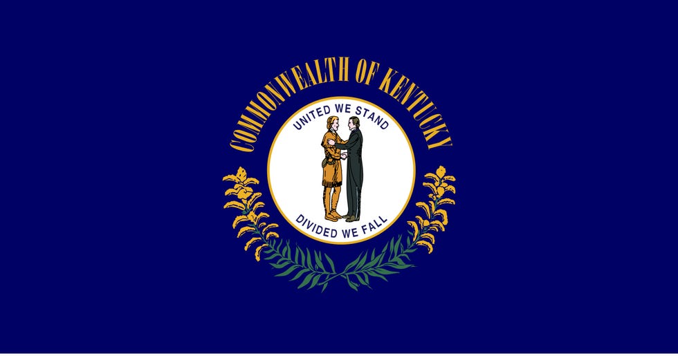 The Kentucky state flag is blue and features two guys shaking hands, and thus looks nothing at all like the Confederate flag, which has no guys shaking hands on it at all.