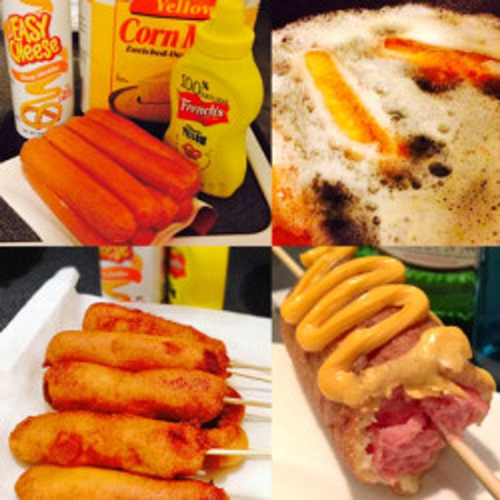 Can't visit a county fair? No problem! We are taking the low road to perdition from the comfort of our homes. Corn dogs, because all that grease makes everything a little easier to swallow. Here is how you do it: