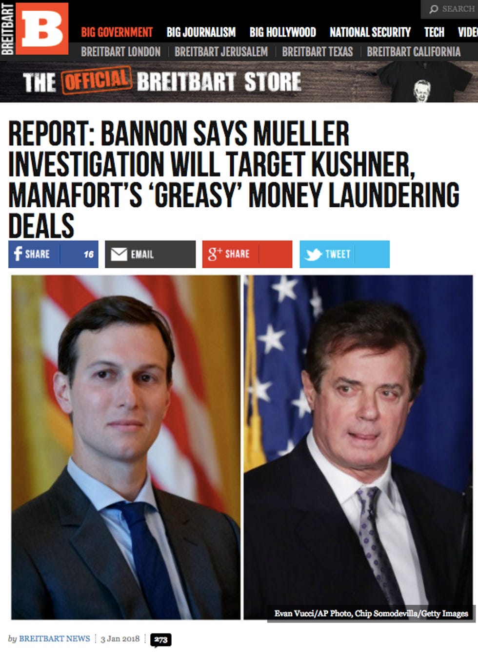 Huh. So all those Breitbart hit pieces on Mueller are just bullshit propaganda since Trump's going down for money laundering? What a coincidence! That lines up exactly with what those Fusion GPS guys said this morning in the Times . Guess the mothership will just have to concentrate on the greasy Kushner angle instead.