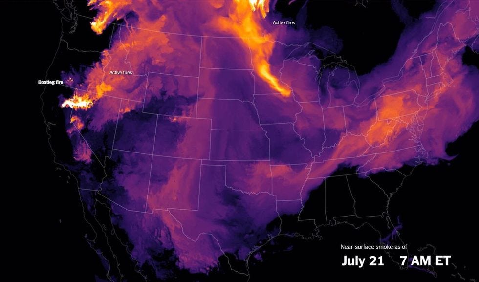 In southern Oregon, the Bootleg fire complex continues to burn ; as a New York Times animated data visualization shows, smoke from fires in the Western US and midwest Canada has blanketed much of the country, even causing haze thick enough to block the sun in New York City.