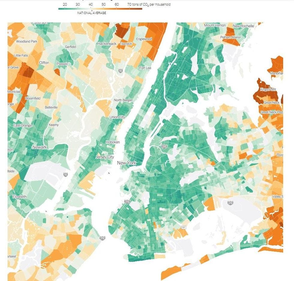 The New York Times brings us a pretty cool data visualization mapping out the carbon emissions in cities around the US, comparing neighborhoods by the amount of greenhouse gases for which their residents are responsible, at least statistically. Rather than showing where carbon emissions actually enter the atmosphere — that would be a map of powerplants, factories, major roads, and airports — the maps look at the emissions generated by what households typically consume in a given area. As the Times 'splainers (free gift linky),
