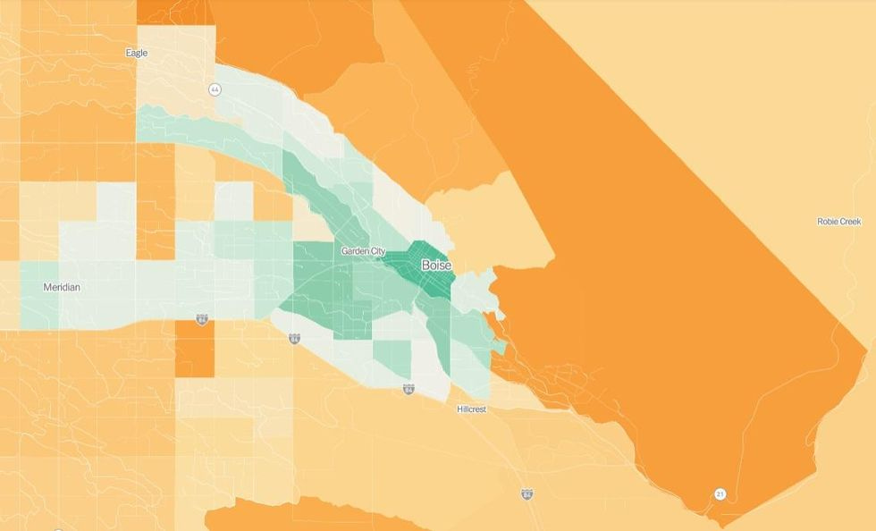 Because the Times knows where I live (yeah, yeah, it's just my IP address, that's not unsettling), it loaded up a map for Boise, and the lower-than-national average parts of this burg map pretty well to the city's two major bus routes and densest neighborhoods: