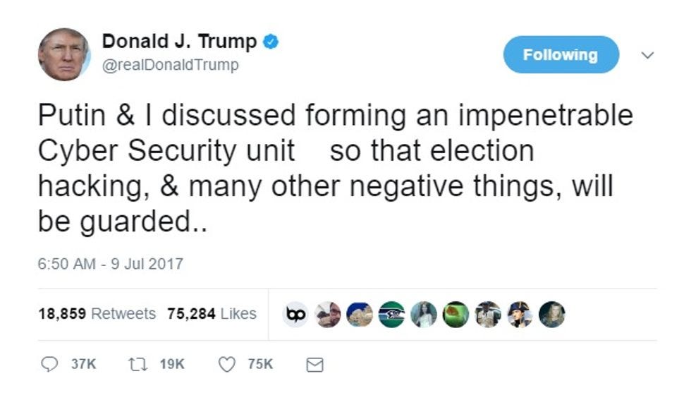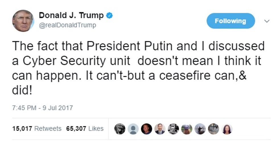 Politico reported that Trump's idea didn't come completely out of his vegan baby butthole; rather, it seemed to refer to a somewhat different initiative announced Friday, a "joint cyber working group tasked with establishing a framework to resolve digital disputes," which is a far cry from some kind of "security unit" that would jointly police the cybers. Secretary of State Rex Tillerson said Sunday that the goal there was to "have a dialogue" with Russia about achieving reasonable assurances that neither country would interfere with each other's computer networks, which actually is the sort of thing previous administrations have pursued. For instance, the Obama administration used a computer equivalent of the "nuclear hotline" between the U.S. and Moscow last fall to tell Russia to knock it off with the hacking of state election systems. While Politico didn't explicitly say Trump had just fucked up what he'd been told about the dialogue around increasing security, we're perfectly willing to believe Trump may have done just that: He got briefed about the working group and, somewhere in Trumpbrainspace, converted that into a proposal for an "impenetrable Cyber Security unit."