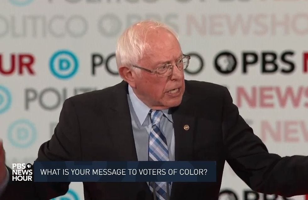 Oh shit, Bernie Sanders started to say something, probably "how about those corporations doing all the structural racism by not going to jail for 'banks'" and Amna fully PERSON OF COLORED HIM about "with all due respect, Senator, the question was about race."