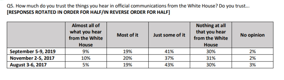 But look at the rest of it! Fully 71 PERCENT of Americans either trust NOT SHIT or "just some" of what comes out of the White House. That is ... encouraging! And remarkable! And also kind of scary that the president is such a pathological liar, because what happens if something truly terrible happens in this country? We are cognizant that we are writing this on the 18th anniversary of 9/11. Can you imagine what would happen in a similar situation today? Nobody would believe a fucking word the White House said.
