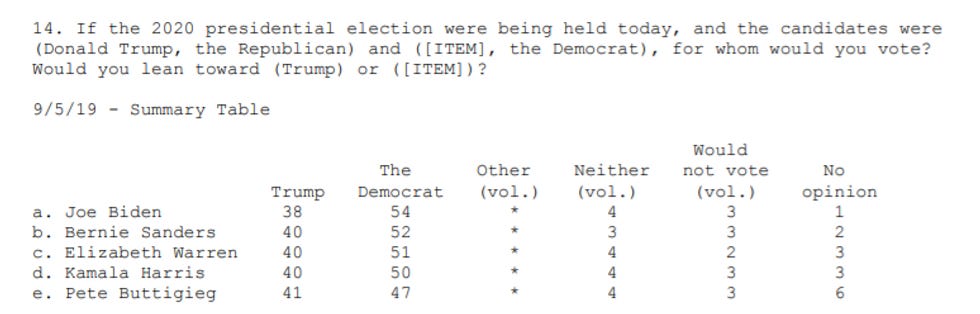 By the way, the margin looks smaller for Pete Buttigieg, but bear in mind that according to this very poll, fully 38 percent of folks still have "no opinion" of Buttigieg, which means 38 percent of folks still have no fuckin' clue who he is. Even with Kamala Harris, 26 percent have no fuckin' clue. Name recognition for the top three is much higher.
