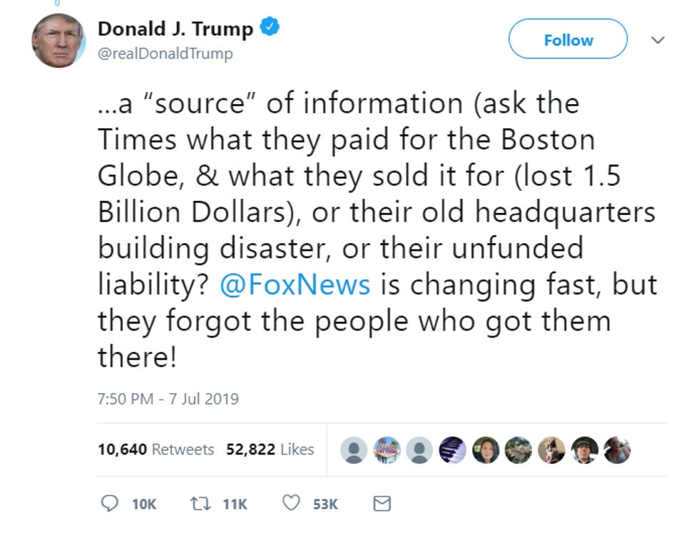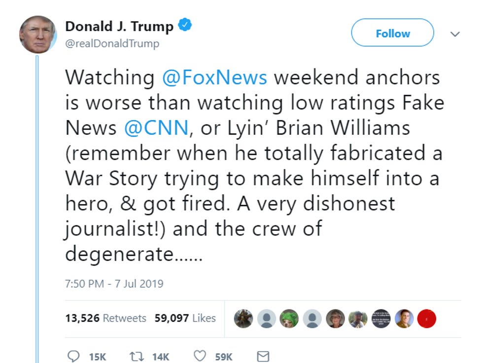 OK, Mister President, we think we get the gist of what it took you three dementia tweets to say right there! You're mad at Fox, the weekend anchors don't flick your nipples with their tongues like you like, and you're just generally crying about life, like you always do. WOMP WOMP.