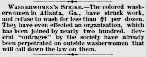 In the summer of 1881, Atlanta was hosting the International Cotton Exposition. This was a fair intended by the city’s “New South” promoter Henry Grady to show how far the city had advanced from slavery. A docile work force without slavery was part of the image he and others wanted to promote. But the laundry workers had different ideas. On July 19, twenty laundresses and a few men met and decided to form the Washing Society and organize their fellow workers for a strike to demand higher wages. They did have one advantage. Unlike the domestics who worked in white homes, laundry was all outsourced to Black women’s homes. So they were independent on a daily basis, not laboring under the eyes of whites. They could form such an organization.