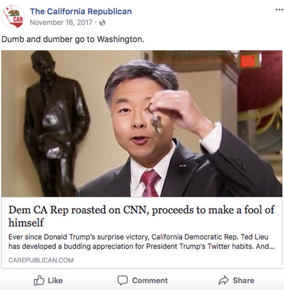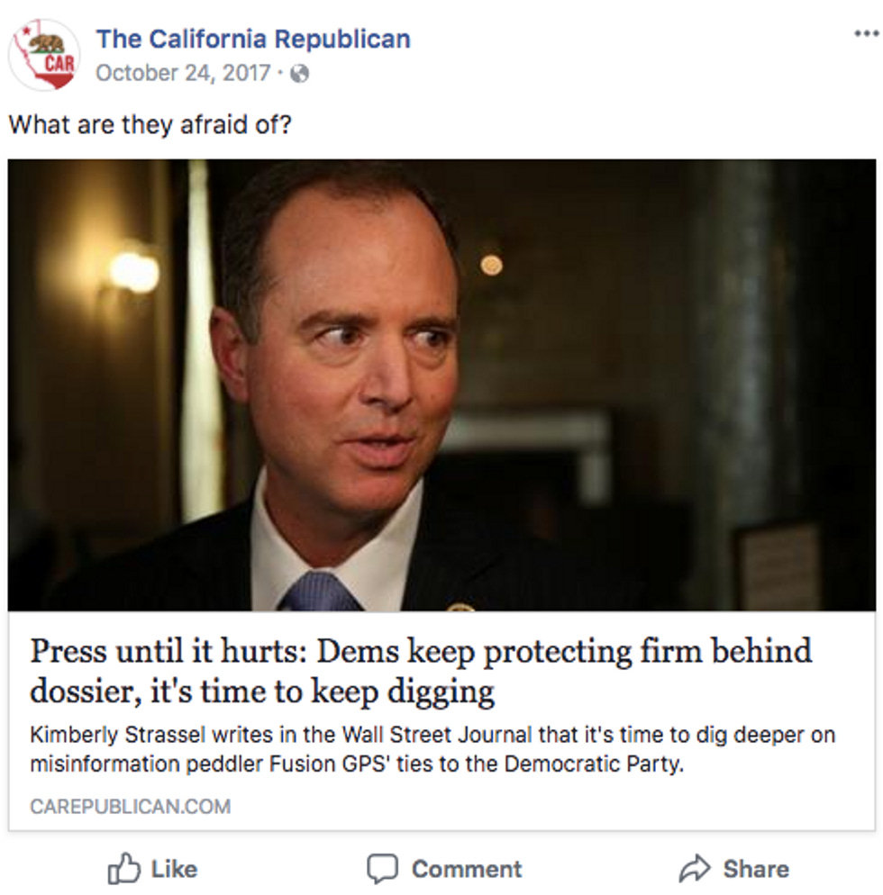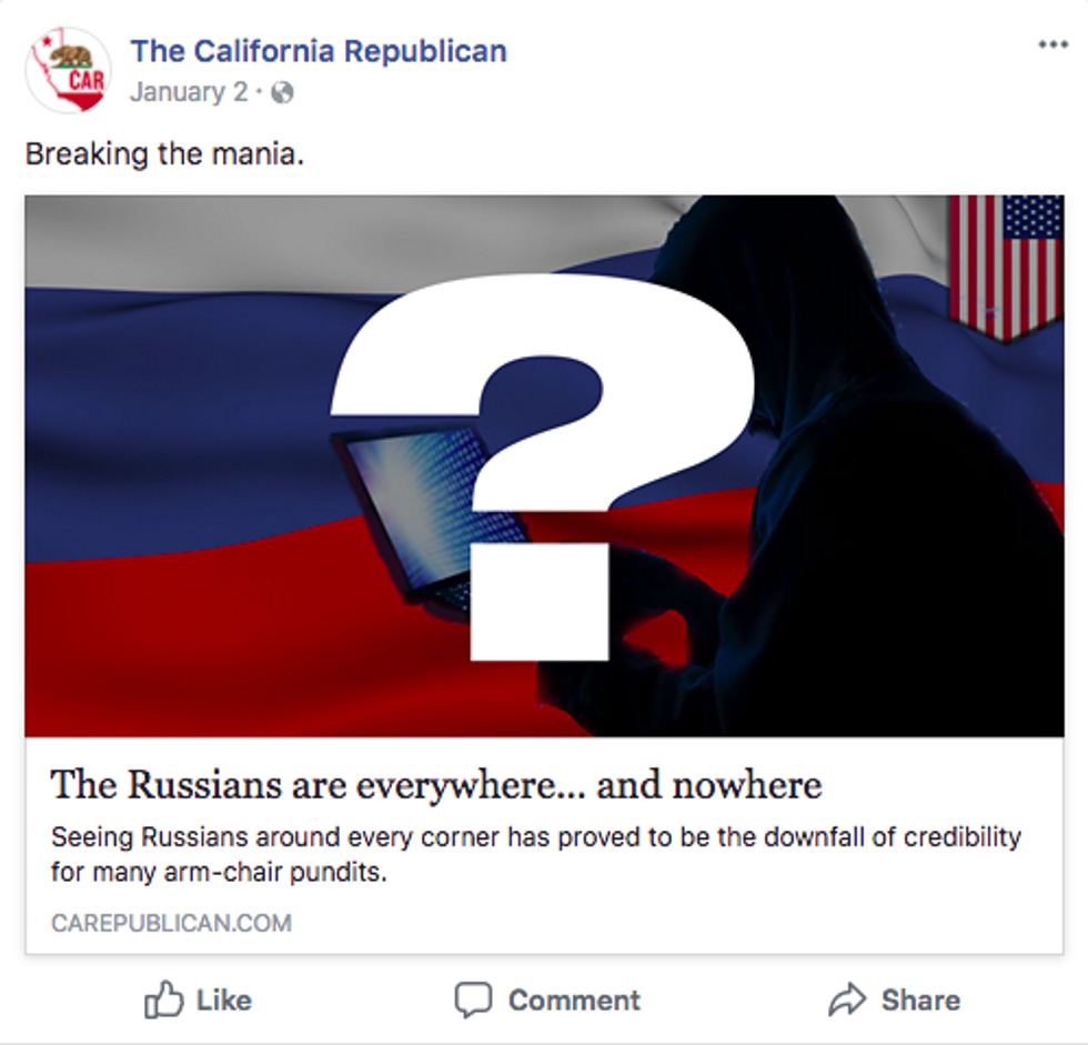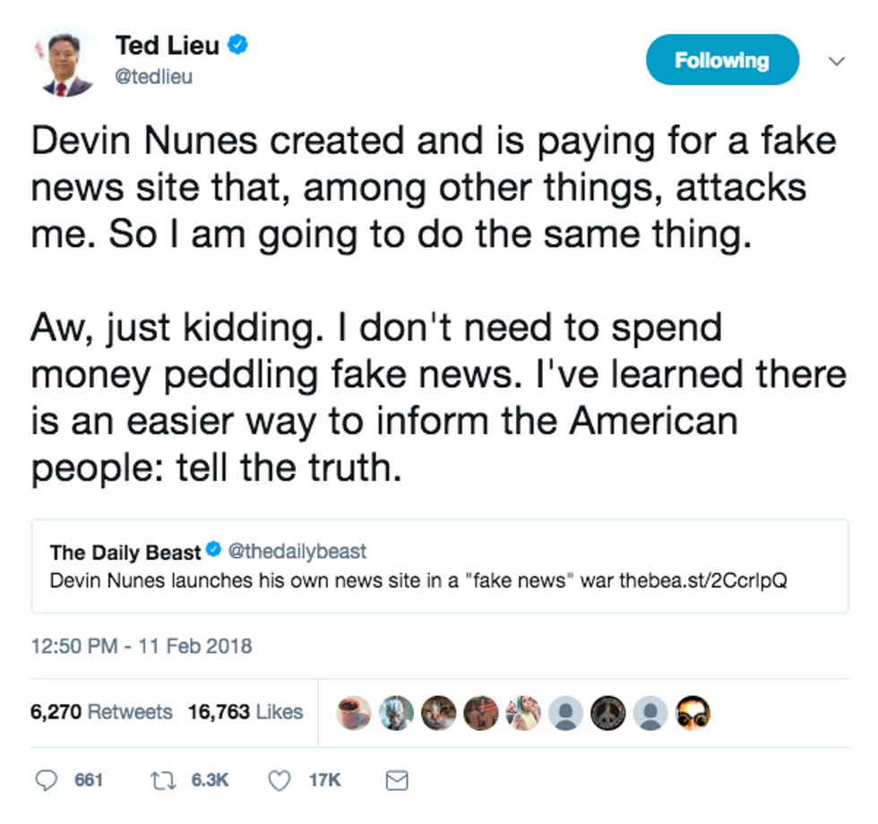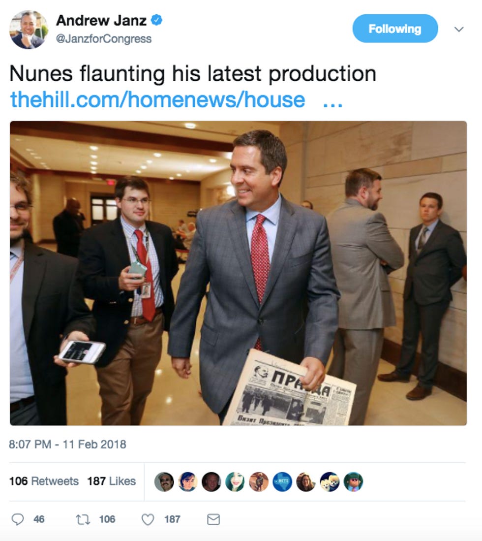 Let's ponder for a moment the irony of Devin Nunes, a guy who is supposed to be investigating how Russians sponsored fake news stories like the one below to interfere with the 2016 election, directing his energies and campaign dollars instead to establishing his own fake news site.