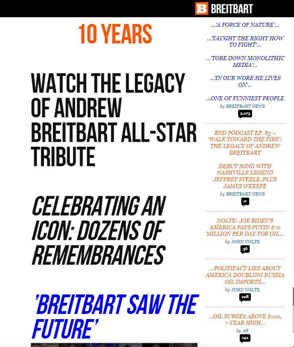 If you were a casual reader looking at the homepage of Breitbart dot com today, you might think the site was marking the tenth anniversary of its founder's death with a big collection of eight stories about Andrew Breitbart, the Man and his Legacy.
