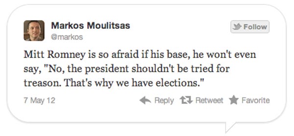 Hey Wonkers, remember this? The horror in Ol' Walnuts's eyes as he realized the tidal wave of fucking nuts to which he was in thrall? Good times! But remember also (you should, because you just watched it) how Country First stood up to that lady and actually told her something she did not want to hear? Weird, right? (VERY weird!) Well don't worry, everything is back to normal and the pander is at its usual 11, and when a lady yesterday told Mitt Romney that President Fidel Castro Obama should be arrested for treason, he just went with it, because he is a went-with-it kind of guy!