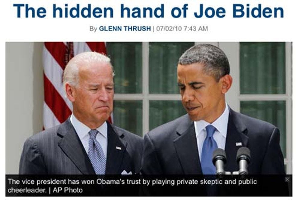 This photo is currently on the front page of important Washington political pamphlet The Politico! We didn't click through to the actual story because we fear the tale of how Biden is a sexy cheerleader in public and harsh dominatrix during "private time" would be Not Safe For Work (we work in our filthy home office, but it might frighten the cat). [ Read The Story If You Dare ]