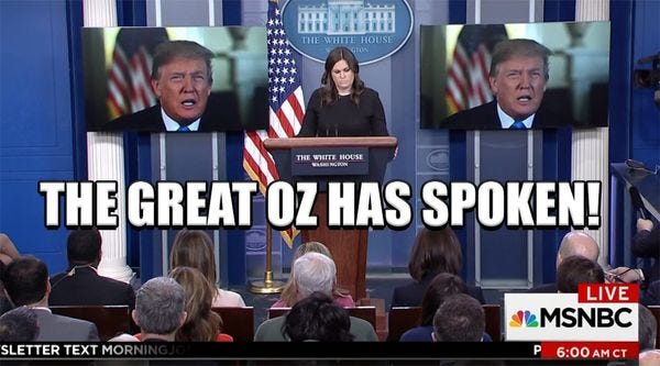 What the hell is going on here? Trump can't walk his ass down the hall to the briefing room? Who does he think he is, the Wizard of Oz? Zordon? It's not like there are any stairs leading to the briefing room. Your editrix says her money is on CGI Trump whose robot voice ain't learned to inflect yet.
