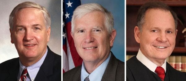 In addition to Strange, who picked up Trump's endorsement yesterday, the other top candidates are Congressman Mo Brooks (R-MSNBC) and former Alabama Supreme Court Chief Justice Roy Moore (R-Ten Commandments), who finds himself free to run for Senate since he got booted for loving Jesus too much. The race so far has been largely about the practical pocketbook issues that matter most to Alabamans' daily lives, like which candidate can make the most over the top display of his love for Jesus and Trump.