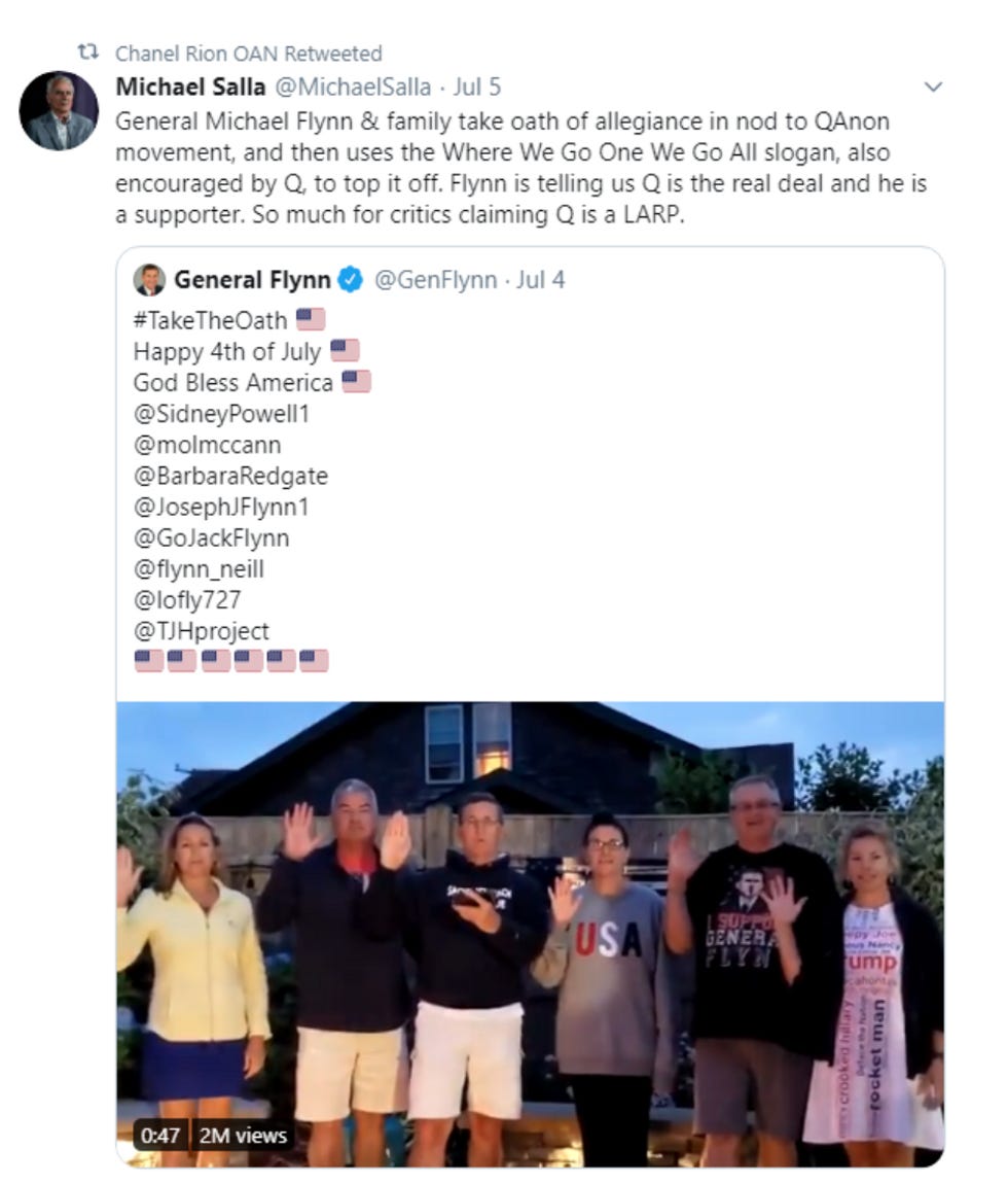 I could be wrong. Rion has used her platform to promote a variety of stupid conspiracy theories and has retweeted multiple Q accounts, including one suggesting that Michael Flynn taking the oath was proof that Q is real.
