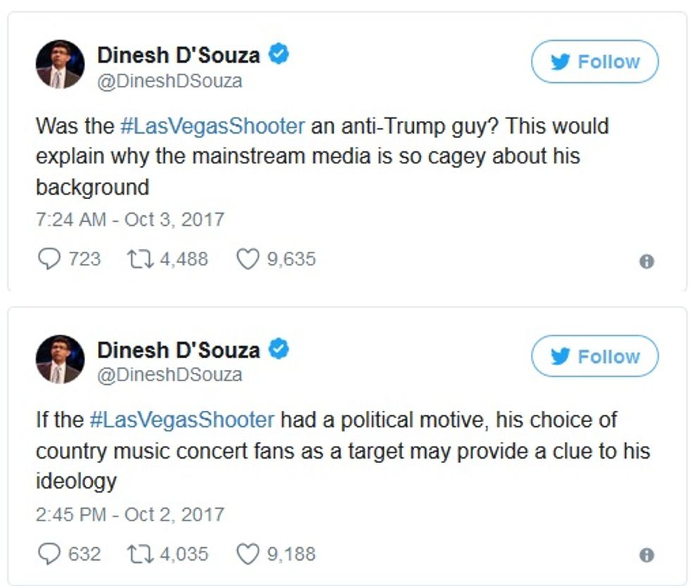 Also, too, there's all the compelling evidence that Stephen Paddock was a man who hated Donald Trump, and shot up a country music concert because country music fans universally love Donald Trump. Heck, Conservative Thought Leaderer and Convicted Felon Dinesh D'Souza thinks that makes a lot of sense: