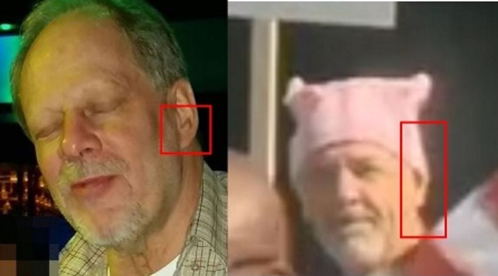 Pam Geller stepped a bit outside her Muslim-hatin' comfort zone to explain that some guy wearing a pussy hat and a pink NASA tee shirt in a blurry photo of an August rally in Reno just had to be Paddock, because just look: It is an old guy with a beard and... AN UNDETACHED EARLOBE!