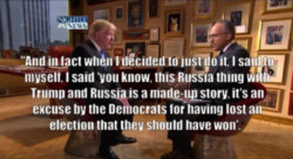 But he cannot possibly be stupid enough to have told Politico that President Sundowners Syndrome wants to Let's Hug It Out, Bitch with the Special Counsel and his League of Scaryass Lawyers. Yes, we know the old man said he was "100 percent" willing to testify. BUT HE WAS LYING! It's kind of his thing!