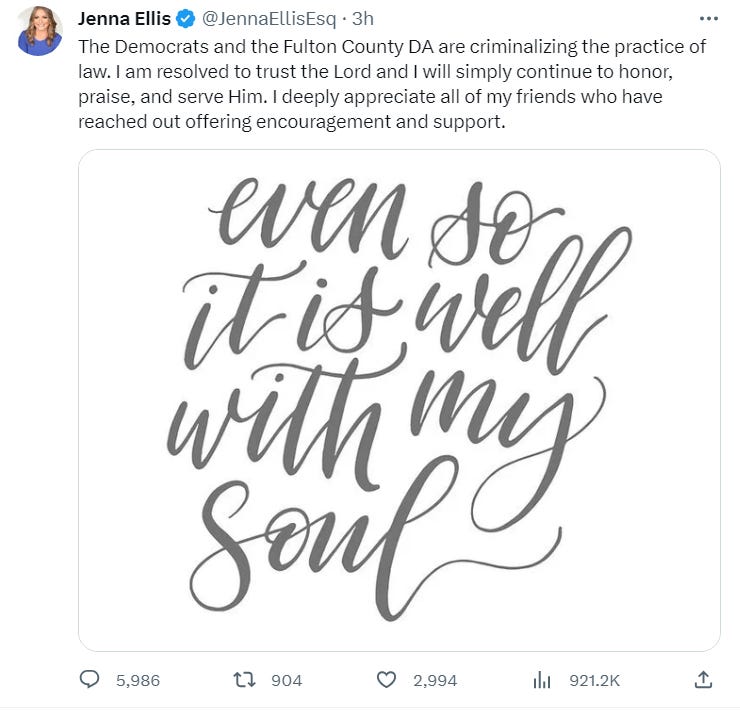 Indicted Jenna Ellis, are you Live, Laugh, Loving about how much Jesus loves you and getting ratio-ed to fuck for it?