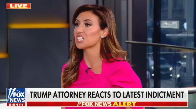 Habba said this is “third world stuff.” She lied and said the indictment “went up before a grand jury voted on it,” because all the raccoon-brained wingers have decided that whatever happened with that weird, unofficial document that was briefly posted to the Georgia courts website yesterday was tantamount to … well, they haven’t decided what it’s tantamount to, but it definitely invalidates the charges against Trump, certainly, probably.