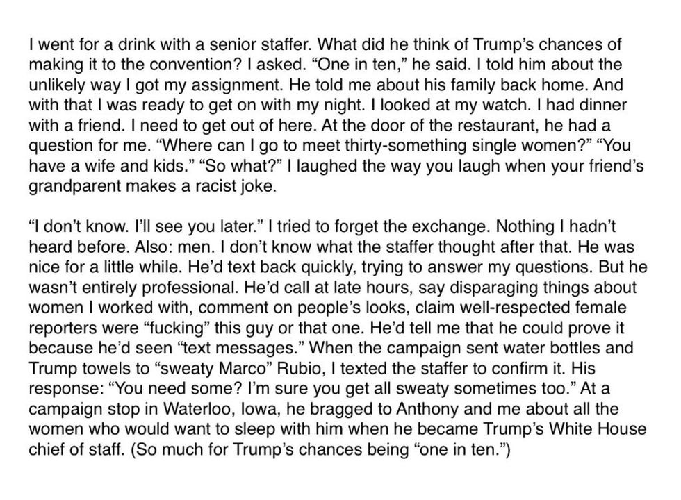 Check out this gross story about UNNAMED MARRIED MAN TRUMP CAMPAIGN GUY, who was gross toward Tur in an indirect way, but was mostly just a gross pig man who sought her advice on where to get some adulterous lady strange at a campaign stop. After you read it, we will get out our Glenn Beck white board and connect the dots and figure out who it was!