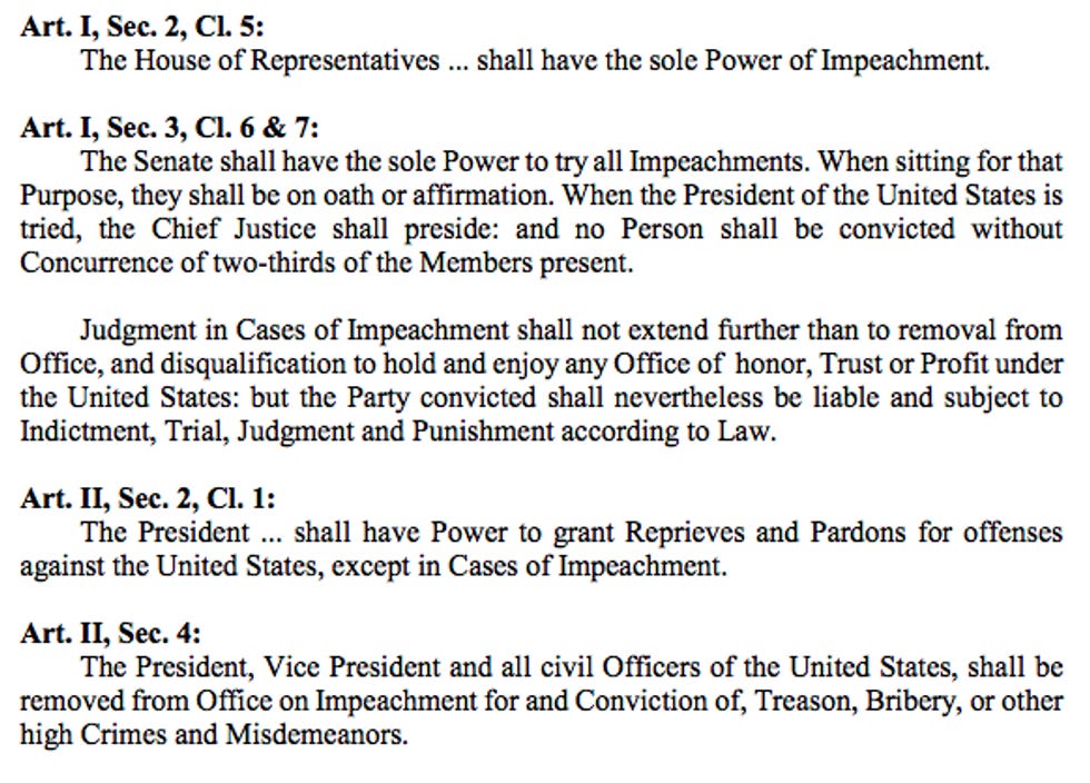 In fact, here's a handy list of everything the Constitution says about impeachment, just in case someone at the White House decides to look at it one of these days.