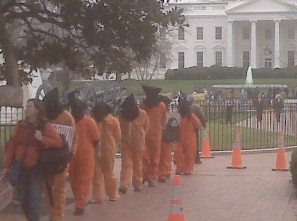 OMG prisoners from Gitmo have flown up from Cuba -- just for the afternoon, gotta work tomorrow morning -- to fête Barack Obama and his barely visible green fountain! These guys will just do wonders for the town of Leavenworth, Kansas. What a completely insane picture from Wonkette ultra-abortionist operative "Jeffrey."