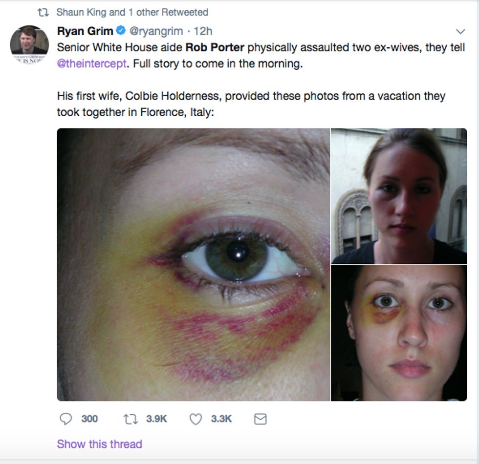 There's really not any possible case to be made that these women are just coming out of the woodwork now in order to make the Trump administration look bad. Willoughby had a protective order against him in 2010. The FBI interviewed both Holderness and Willoughby when Porter was tapped for his White House position, and were shown the pictures of Holderness's black eye. These things have been known for a while now. and unless these women are also time-travelers, they are not part of any "smear campaign."