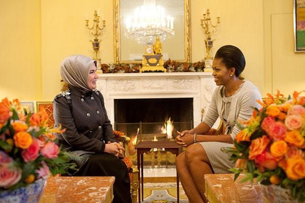 It's your Friday Funny Flickr Foto! This installment features two first ladies with identical round head-hats, one made of metallic cloth and one made ofhuman hair.SYMMETRY! [ Official White House Flickr Feed ]