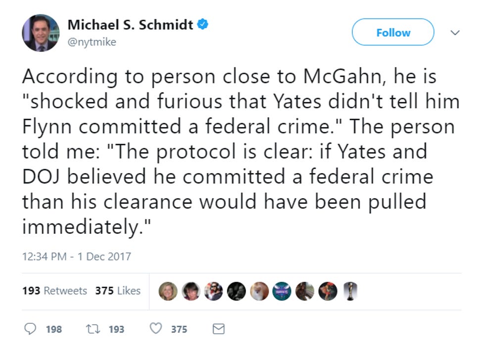 And now CNN is blabbing that Sally Yates even provided McGahn with a transcript of the conversation where Michael Flynn asked Russian Spy/Ambassador Sergei Kislyak not to enact retaliatory sanctions. So Don McGahn is left pretending that he was just aw, shucks unawares that lying to the FBI is a federal crime.