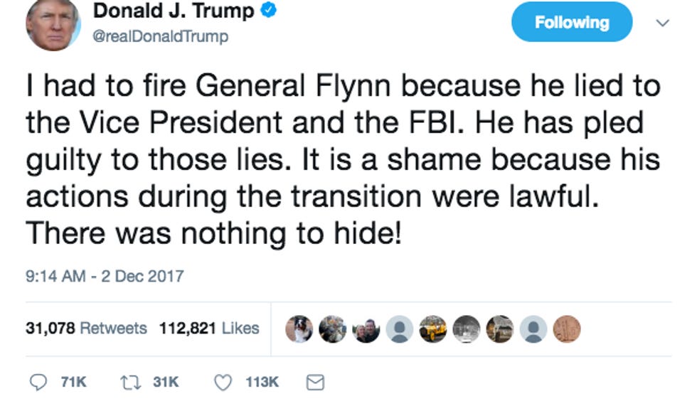 We fired Flynn because he told Mike Pence that he never discussed the sanctions we sent him specifically to discuss.