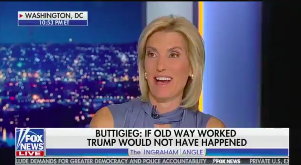 Unfortunately, Laura Ingragam is both of evil and capable of simple inference. She thought there was “wisdom" in Buttigieg's criticism of Obama. She looked so happy when she put it together, like she was carving into a sous-vided baby cooked to perfect medium rare.