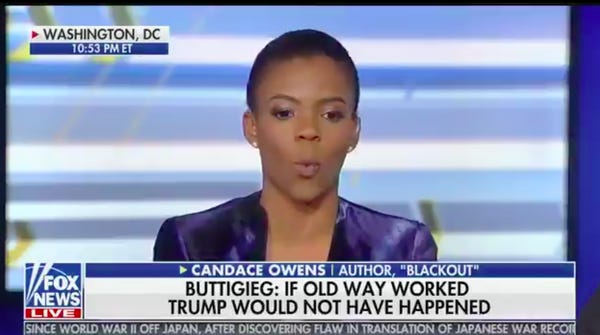 Tomi Lahren's blackface performance art character, Candace Owens, appeared on "The Ingraham Angle" last night, and it was just a coupla white chicks sitting around talking about race and Pete Buttigieg. Mayor Lochinvar of the Democratic Party got in a spot of trouble the other day when he implied that Barack Obama was a big loser whose incompetence led to Donald Trump raining hell on the American people. Evan Halper at the Los Angeles Times later clarified that Buttigieg didn't actually call out the "failures of the Obama era" but instead decried the "failures of the old normal" like the dismissive "OK, Boomer!" Millennial he is. That's some pretty sloppy reporting there. But after the misquote's retraction, Buttigieg followed up with some nice words about Obama and everyone moved on.