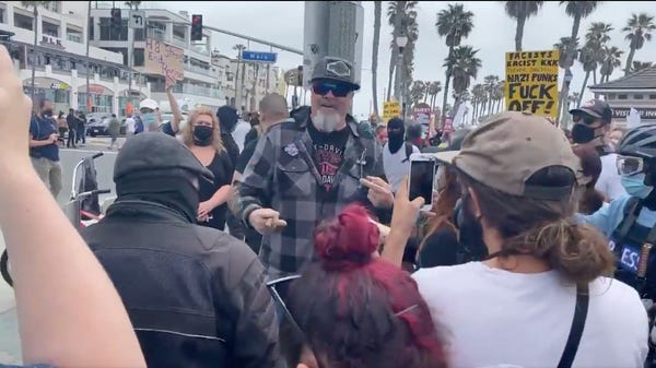 #HuntingtonBeach : Lone guy in the army green cowl ran through the BLM crowd yelling #WhiteLivesMatter & This Is A… https://t.co/7mFSpjzKtQ