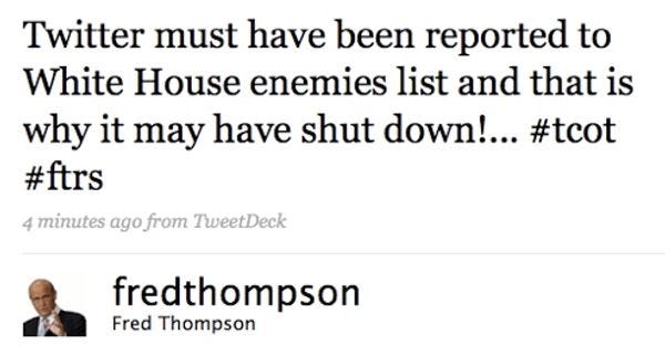 The Twitters broke for a while today, or yesterday, who gives a shit, but once things became operational again, fat retarded donkey Fred Thompson was ready with a one-liner. Did you know that Barack Obama now has his SS arresting everyone on the Internet? This is what the Republicans are saying, and we have no reason to doubt it. [ Washington Independent ]