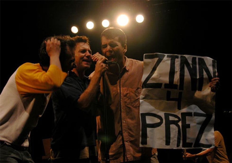 That's Patrick Gavin on the right, next to Pearl Jam's Eddie Vedder. Gavin is holding a sign urging liberal writer Howard Zinn to become president, at the Pearl Jam concert. Who knows? Gavin's career is over.