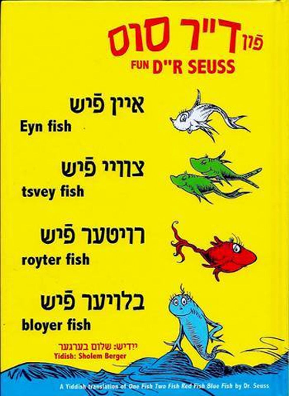 Dr Seuss works improbably well in Yiddish. Yiddish's strength is its onomatopoeic expressiveness; and it contains a lot of Germanic words that are cognates for their English equivalents (such as "bloyer," which means "blue;" and "fish," which means "fish!"), but they're pitch-bent enough to make them sound a little off-kilter, which makes them perfect for a Seussian rhyme.