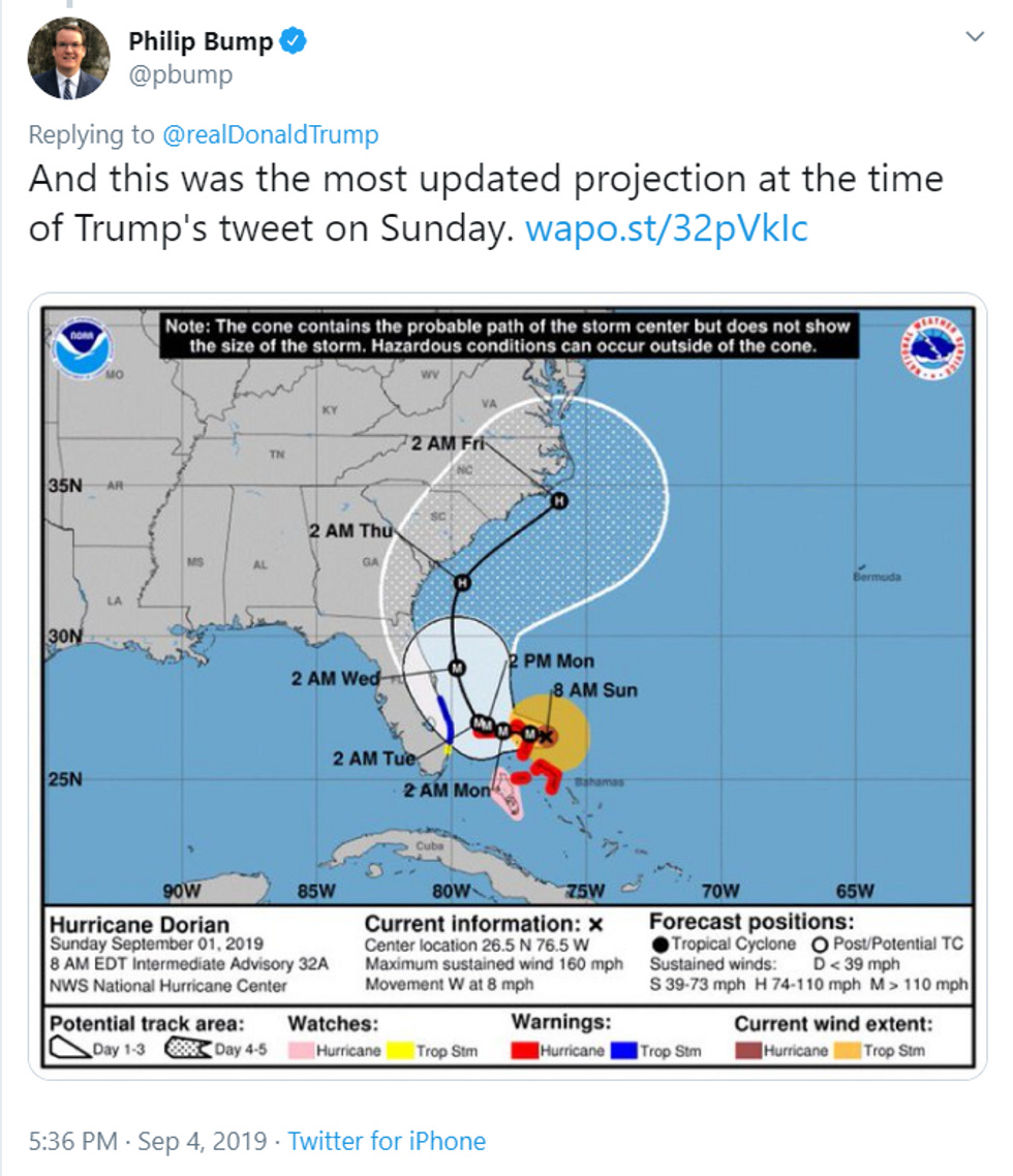 When Trump tweeted his original warning to Alabama, the concurrent National Hurricane Center forecast called for Dorian to pass off the Georgia coast, with the center of Dorian's expected track passing 300 miles east of the Alabama border. The far western extent of the cone was located more than 150 miles east of the Alabama border.