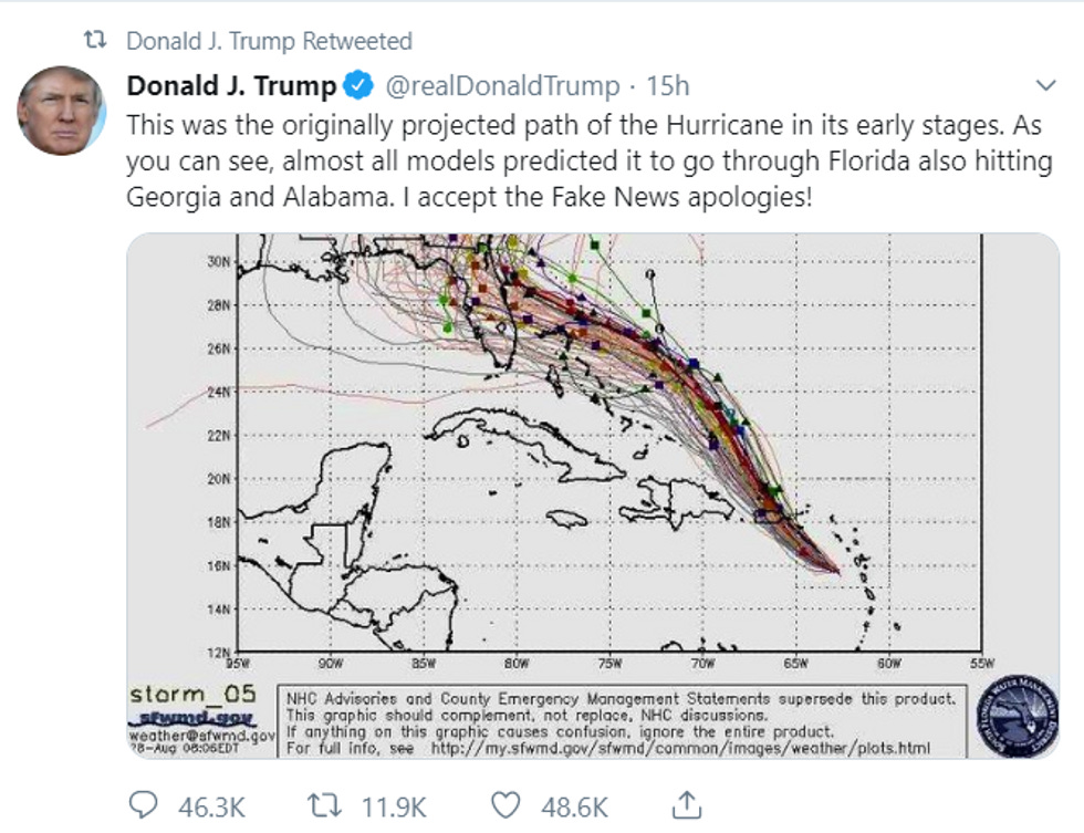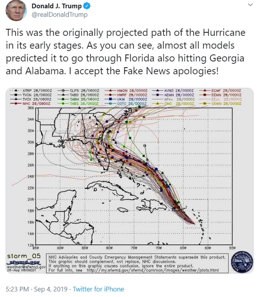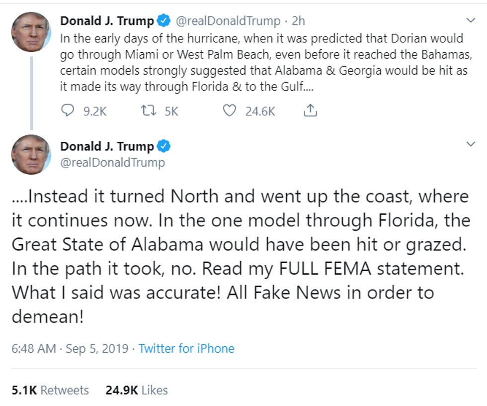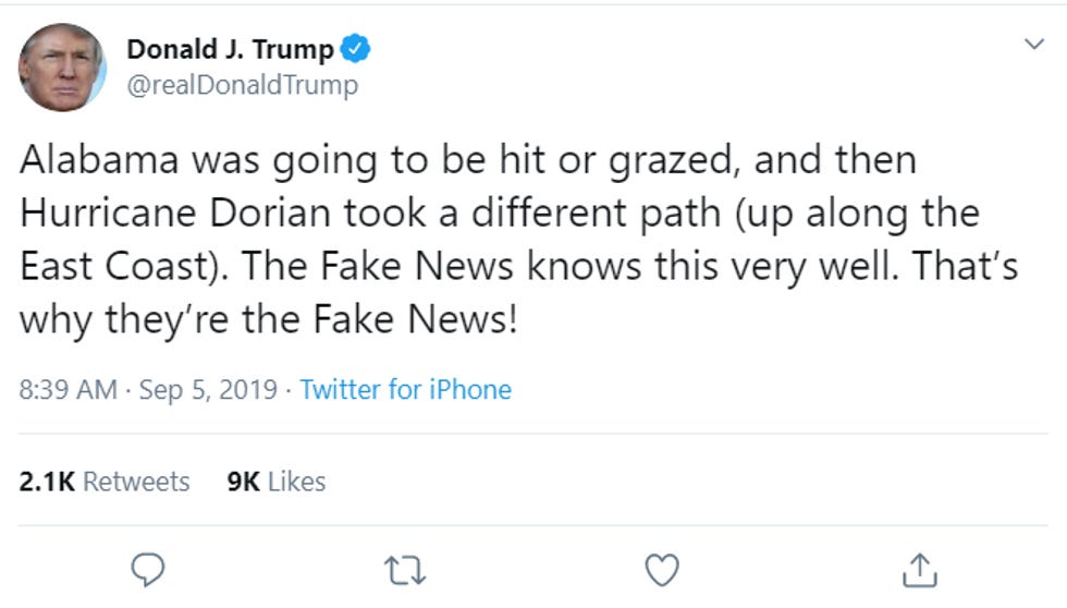 BUT YET TRUMP PERSISTED in hurling Alabama into the imaginary path of Hurricane Dorian that exists in his head. Here's how dipshit woke up this morning: