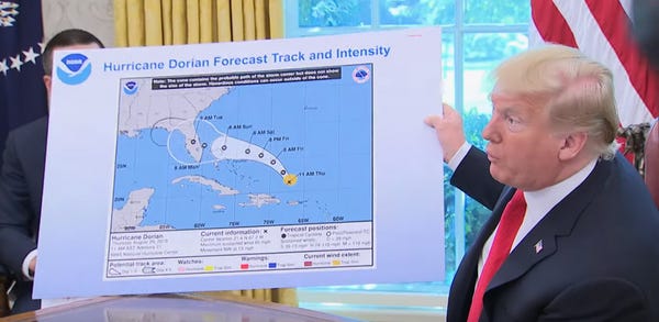 And why was Trump doing this? Because he tweeted on Sunday that it was going to Alabama, everybody knows Hurricane Dorian is going to Alabama, such a total Dorian, destroying Alabama.