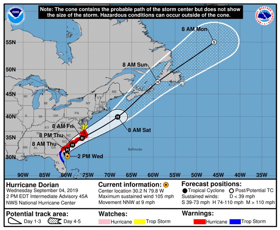 The most that Alabama was included in the NOAA's projections was late Friday, when the cone of possible directions briefly brushed against the most extreme southeastern part of the state. That cone, of course, doesn't indicate that the hurricane would swell to a size greater than the state of Georgia; instead, it shows a range of possible places where Dorian might end up. Maybe — maybe! — it would be brushing against Alabama by 2 p.m. Wednesday.