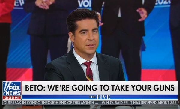 As the segment progressed, Watters explained to stupid liberal person Juan Williams that there's simply no way to take away people's beloved bullet hoses, because assault weapon owners are exactly the sort of cop-killing sociopaths who'd shoot the cops coming to take their guns away. O'Rourke had said, fairly plainly, "You know what? If you have a gun that's made for the battlefield, you shouldn't have it in your home," and that actually was pretty popular with the Democratic debate audience.