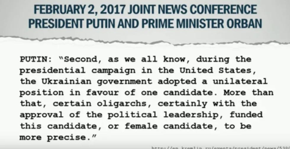 If you watched all 15,672 hours of impeachment testimony like a good little American, you remember that several times, Democratic lawyer Daniel Goldman showed a quote from a press conference Putin gave with Hungarian shithole dictator Viktor Orbán earlier in 2017, before that Hamburg G20 meeting, where Putin appeared to publicly seed the Kremlin Ukraine conspiracy theories now endorsed by Trump and half the GOP: