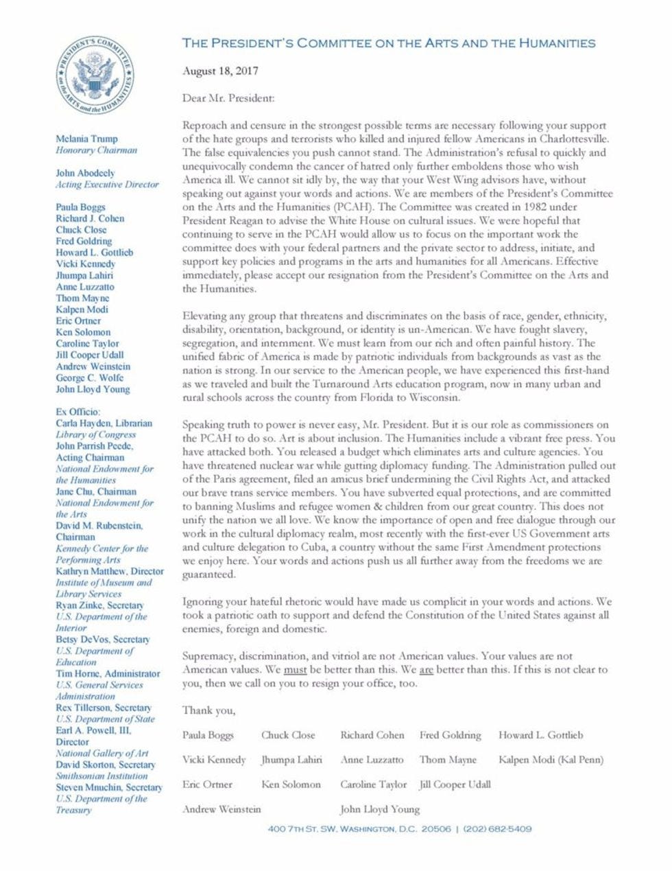 You see what he did there? He spelled out I-M-P-E-A-C-H in the first letter of each paragraph! He told CNN he was inspired by the resignation letter written by ALL THE MEMBERS of The President's Committee on the Arts and the Humanities, which employed a similar tricky dicky: