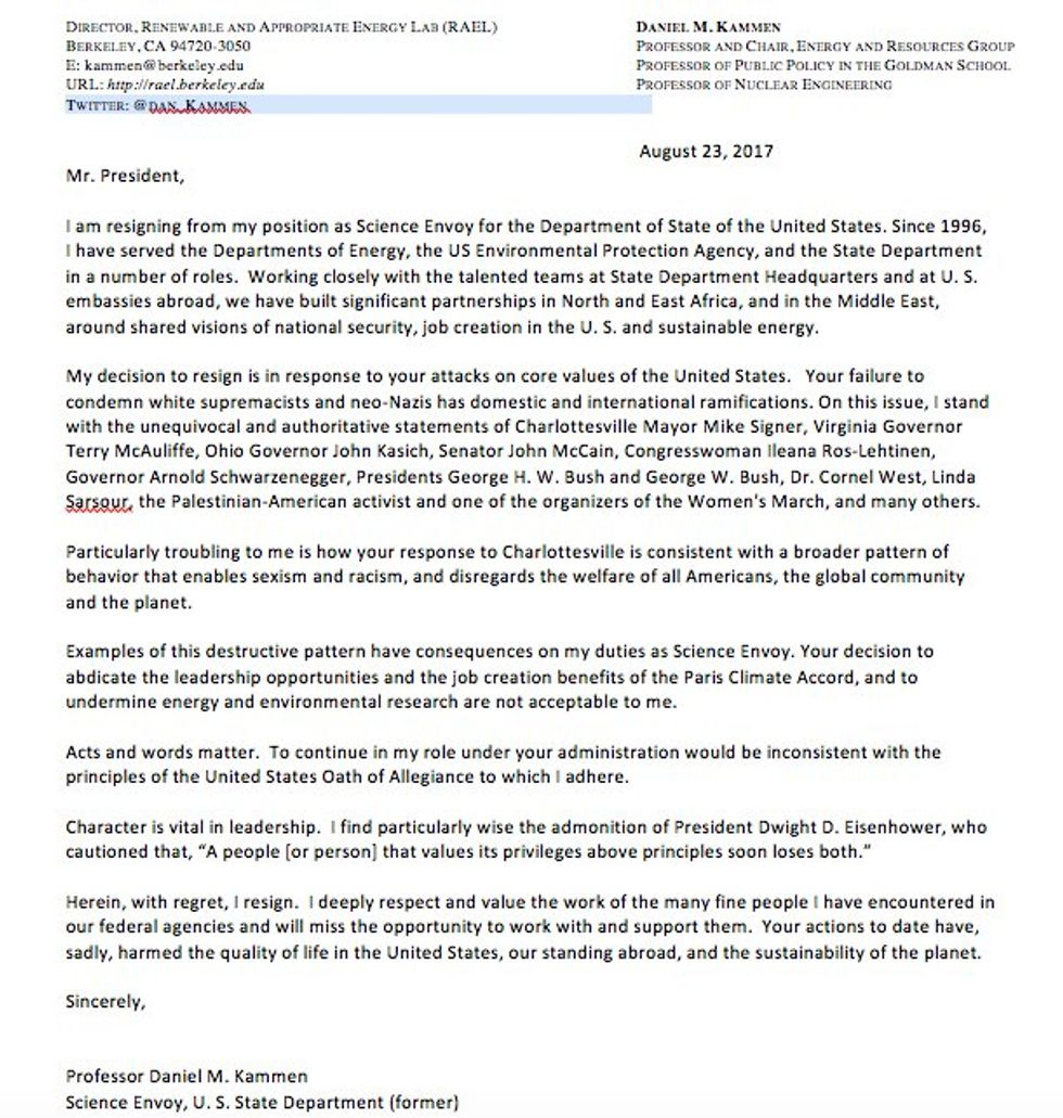 Resistance to Donald Trump and his sucky terribleness is breaking out all over, in the form of hilarious resignation letters! Daniel Kammen, a State Department envoy for science, resigned his post Wednesday, citing Trump's disgusting white-supremacist-enabling response to Charlottesville. And he did it with a SECRET MESSAGE!