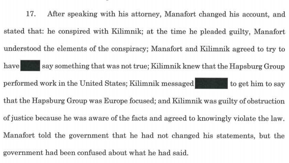 But when Robert Mueller came calling, Manafort needed to bury his tracks. So he reached out to his Kremlin-linked pal Konstantin Kilimnik so that he could get the story straight with Hapsburg Group witnesses. Because if he could get them to say the Group's activities were primarily centered in Europe, Manafort could defend himself against a charge of violating FARA.