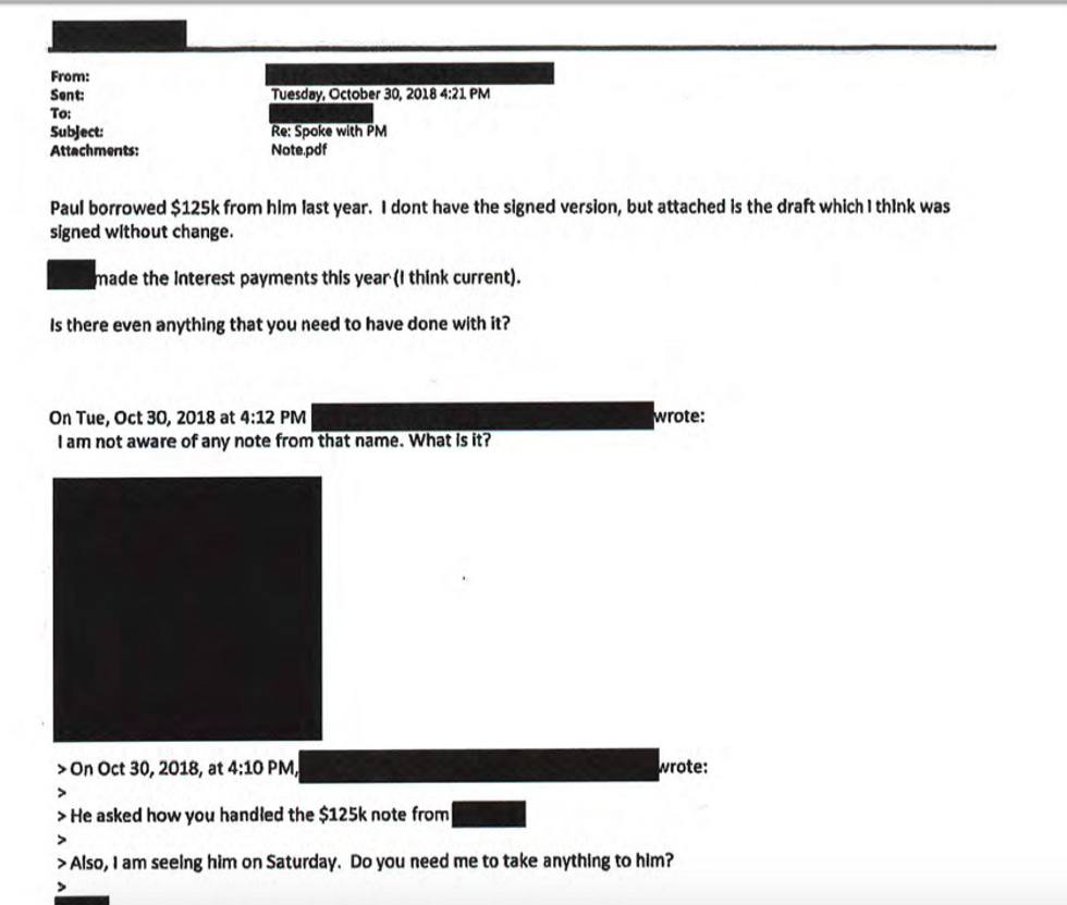 But wait, there's more! In an attempt to hide this payment from the FBI, Manafort and someone, possibly his buddy Laurance Gay, came up with a "promissory note" in 2018 to cover their tracks, thus converting the MMS payment to a "loan."